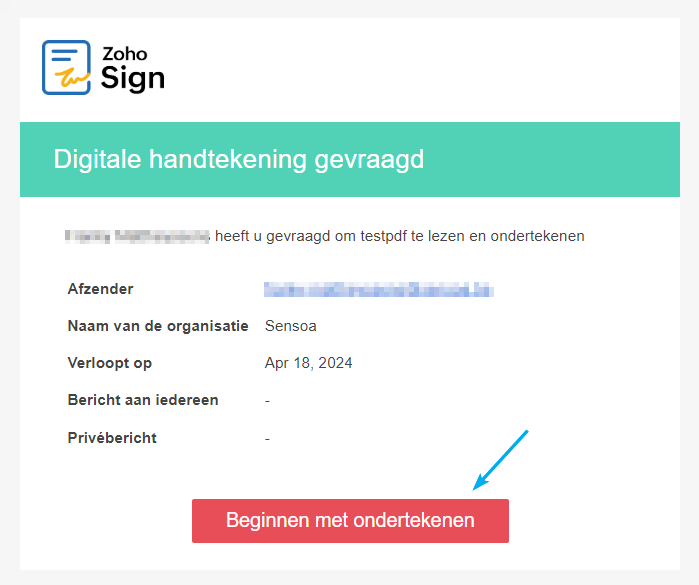 Je wordt nu doorgestuurd naar Zoho Sign om het ondertekenen te vervolledigen.