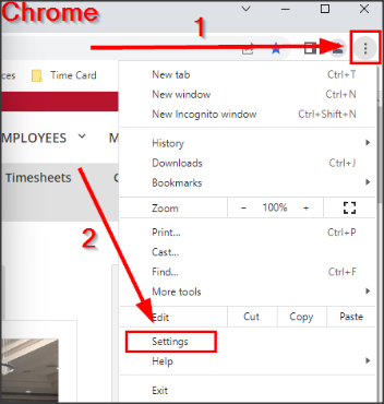 - Klik op de 3 puntjes rechtsbovenaan je browser venster en selecteer Settings/Instellingen in het uitklapmenu.