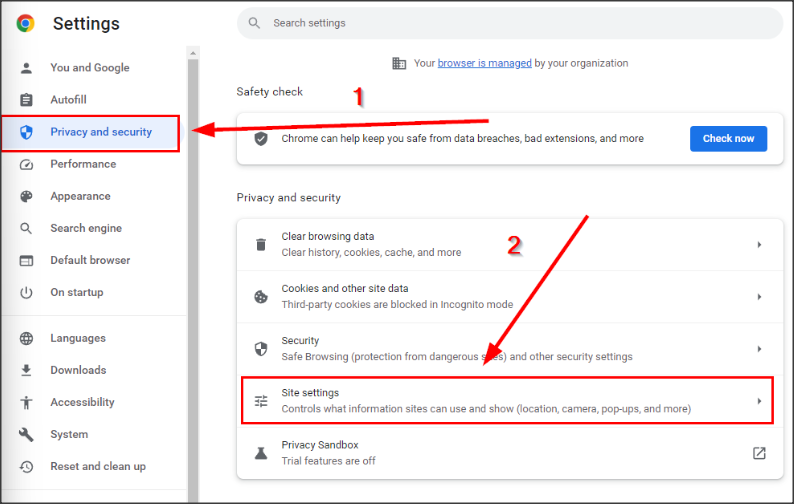 - Navigeer naar Privacy and Security aan de linker zijde en klik op Site settings.