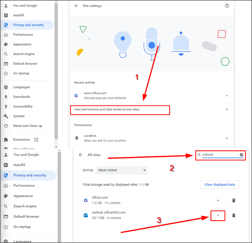 - Klik View site permissions and data stored across sites, zoek Outlook in de rechterbovenhoek, open het uitklapmenu door op het driehoekje te klikken.