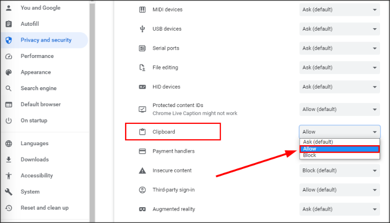 - Scroll naar beneden tot Clipboard/Klembord, selecteer Allow/Toelaten uit het uitklapmenu aan de rechterzijde.