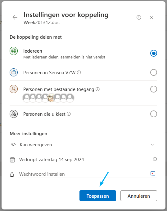 - Druk op 'Toepassen' en plak de koppeling in je mail.