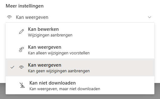 - Om enige bewerk rechten mee te geven druk je op het pijltje achteraan 'Kan weergeven' en selecteer de gewenste rechten.